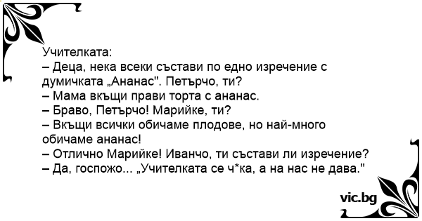 Учителката им вели на децата на напишат реченица во која ќе го употребат зборот „ананас“. Цветко: