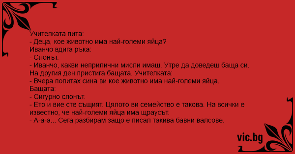 Вертається Вовочка з школи з двойкою. Батько питає: — За що? — А на біології училка питала, в кого найбільші яйця. — Ну? — Я кажу — в слона. А вона мені — ні, в страуса. — Ніііі сину... Таки в...