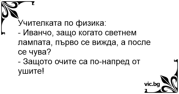 - Иванчо, защо когато светнем лампата, първо се вижда, а после се чува?