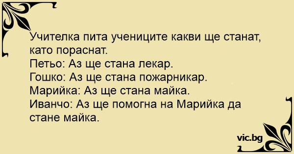 Pita učiteljica đake šta će biti kad porastu. Jovica kaže: - "Ja ću biti ljekar." Stevica kaže: - "Ja ću biti pilot." Milica kaže: - "Ja ću biti mama." A Mujica kaže: - "Ja ću pomoći Milici da bude...
