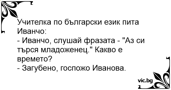 - Иванчо, слушай фразата - "Аз си търся младоженец." Какво е времето?