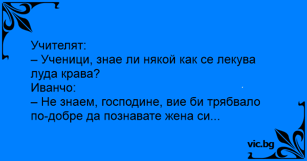 – Ученици, знае ли някой как се лекува луда крава?