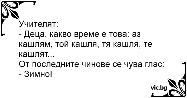 - Деца, какво време е това: аз кашлям, той кашля, тя кашля, те кашлят...
