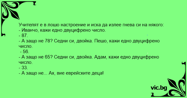 Учитель в плохом настроении, хочет выместить на ком-то свою злость. — Иванов, назови двузначное число. — 87. — А почему не 78? Садись, два. Петров, назови двузначное число. — 56. — Почему не 65? Садись, два. Рабинович, назови двузначное число. — 33. — А почему не... Опять эти ваши еврейские...