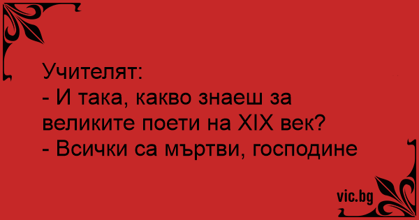 Lehrer zu Fritzchen: Wenn du nur eine Sache weißt, über die Dichter des 17. Jahrhundert, dann bekommst du keine schlechte Note von mir. Versprochen. Fritzchen: Sie sind alle tot. Bulã la scoalã: - Ce stii despre marii poeti ai secolului XIX?(Întreabã profesorul.) - Toti sunt morti, domnule profesor.