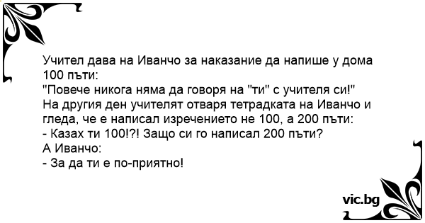 На другия ден учителят отваря тетрадката на Иванчо и гледа, че е написал изречението не 100, а 200 пъти: