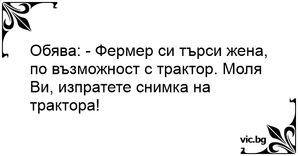 Обява: - Фермер си търси жена, по възможност с трактор. Моля Ви, изпратете снимка на трактора!