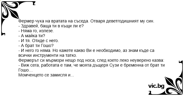 Фермер чуka на вратата на съседа. Отваря деветгодишният му син. - Здравей, баща ти в къщи ли е? - Няма го, излезе. - А майка ти? - И тя. Отиде с него. - А брат ти Гошо? - И него го няма. Но кажете какво Ви е необходимо, аз знам къде са всички инструменти на татко. Фермерът си мърмори нещо под носа, след което леко неуверено казва: - Виж сега, работата е там, че моята дъщеря Сузи е бременна от брат ти Гошо… Момченцето се замисля и казва: - Дааа, ще трябва да говориш с татко. Аз знам, че за бик взема 500 леваа, за свинете по 150 лева, ама за Гошо колко ще ти иска не знам!