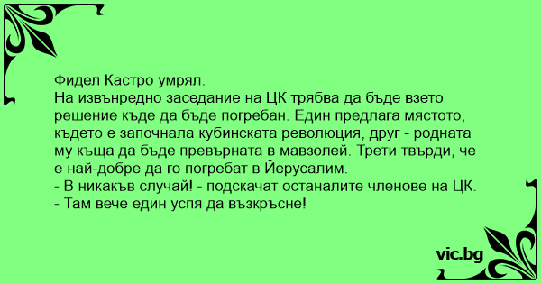 На извънредно заседание на ЦК трябва да бъде взето решение къде да бъде погребан. Един предлага мястото, където е започнала кубинската революция, друг - родната му къща да бъде превърната в мавзолей. Трети твърди, че е най-добре да го погребат в Йерусалим.