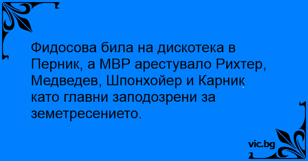 Фидосова била на дискотека в Перник, а МВР арестувало Рихтер, Медведев, Шпонхойер и Карник като главни заподозрени за земетресението.