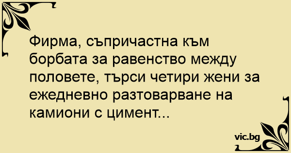 Фирма, съпричастна към борбата за равенство между половете, търси четири жени за ежедневно разтоварване на камиони с цимент...