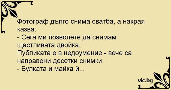 Фотограф на свадба: - Па, каде е среќната двојка да ги сликам!? Младоженецот: - Ете ги, невестата и мајка ѝ!