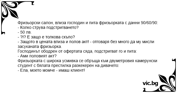 Фризьорски салон, влиза господин и пита фризьорката с данни 90/60/90: