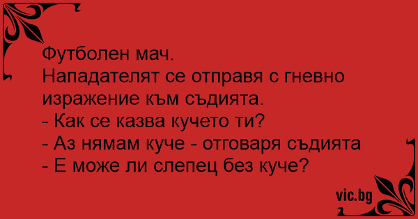 Zavrsi se Utakmica i jedan navijac pridje Sudiji i upita ga: - Jel si Sudija, gde ti je pas? - Kakav pas? odgovori Sudija. - Ja jos nisam nikad video slepca bez psa.