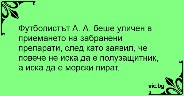 Футболистът А. А. беше уличен в приемането на забранени препарати, след като заявил, че повече не иска да е полузащитник, а иска да е морски пират.