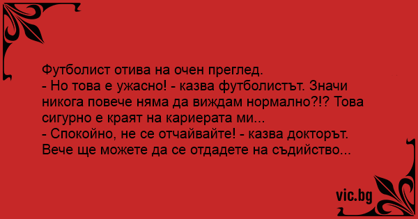 - Но това е ужасно! - казва футболистът. Значи никога повече няма да виждам нормално?!? Това сигурно е краят на кариерата ми...