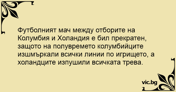 Футболният мач между отборите на Колумбия и Холандия е бил прекратен, защото на полувремето колумбийците изшмъркали всички линии по игрището, а холандците изпушили всичката трева.