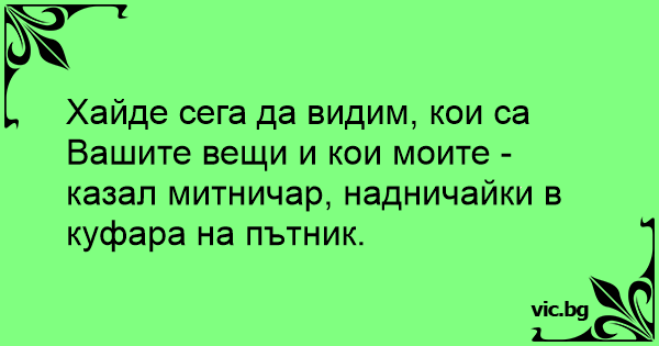 Хайде сега да видим, кои са Вашите вещи и кои моите - казал митничар, надничайки в куфара на пътник.