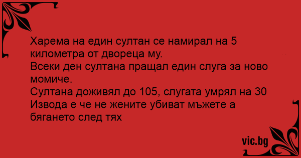 Східна притча: Гарем султана був за п'ять кілометрів від палацу. Щодня султан посилав слугу по нову дівчину. Султан дожив до 100 років, а слуга помер у 30. Мораль: не жінки вбивають чоловіків, а...