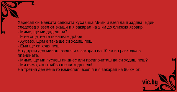 - Хубаво, ще се прибираш пеша, и тръгнал с колата. По едно време вижда в огледалото как Мимето му маха отзад, Ванката обърнал и се върнал при нея.