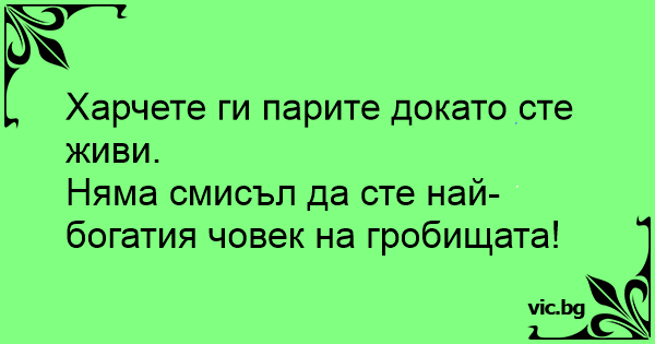 Харчете ги парите докато сте живи.Няма смисъл да сте най- богатия човек на гробищата! 5 0 0 Български Вицове