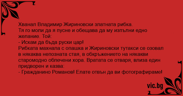 Рибката махнала с опашка и Жириновски тутакси се озовал в някаква непозната стая, в обкръжението на някакви старомодно облечени хора. Вратата се отваря, влиза един придворен и казва: