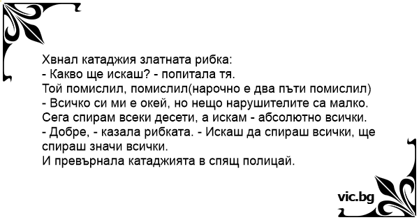 - Добре, - казала рибката. - Искаш да спираш всички, ще спираш значи всички.
