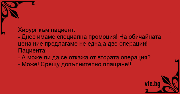 - Днес имаме специална промоция! На обичайната цена ние предлагаме не една,а две операции!
