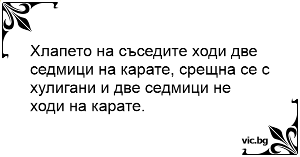 Хлапето на съседите ходи две седмици на карате, срещна се с хулигани и две седмици не ходи на карате.