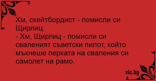 - Хм, Щирлиц - помисли си сваленият съветски пилот, който мъкнеше перката на сваления си самолет на рамо.