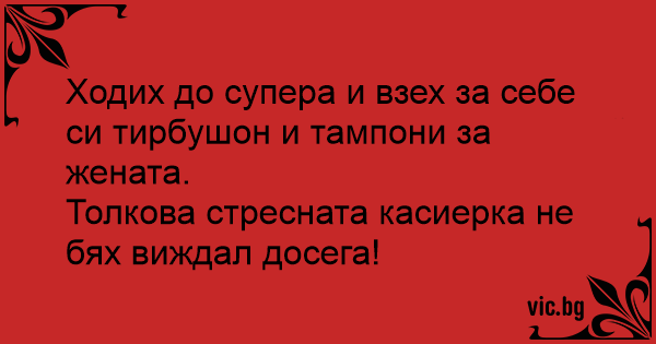 Ходих до супера и взех за себе си тирбушон и тампони за жената. Толкова стресната касиерка не бях виждал досега!