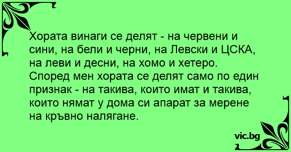 Според мен хората се делят само по един признак - на такива, които имат и такива, които нямат у дома си апарат за мерене на кръвно налягане.