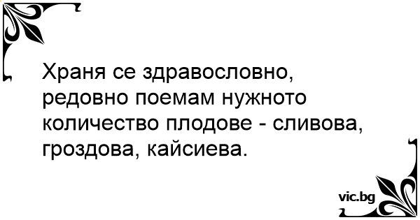Храня се здравословно, редовно поемам нужното количество плодове - сливова, гроздова, кайсиева.