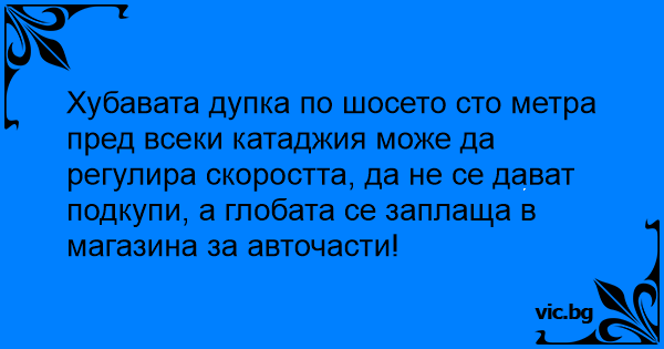 Хубавата дупка по шосето сто метра пред всеки катаджия може да регулира скоростта, да не се дават подкупи, а глобата се заплаща в магазина за авточасти!
