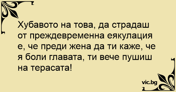 Хубавото на това, да страдаш от преждевременна еякулация е, че преди жена да ти каже, че я боли главата, ти вече пушиш на терасата!