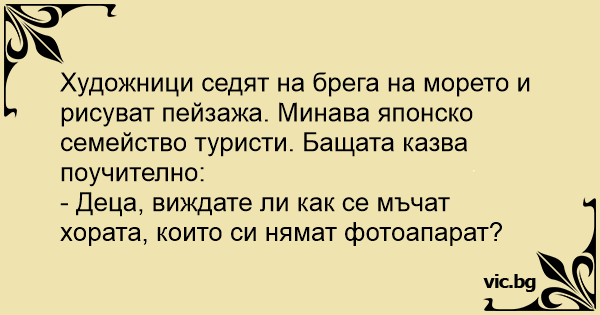 Художници седят на брега на морето и рисуват пейзажа. Минава японско семейство туристи. Бащата казва поучително: