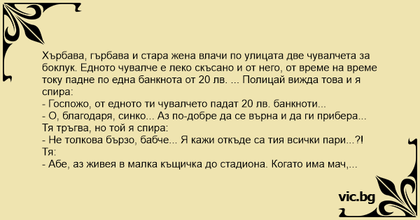 Хърбава, гърбава и стара жена влачи по улицата две чувалчета за боклук. Едното чувалче е леко скъсано и от него, от време на време току падне по една банкнота от 20 лв. ... Полицай вижда това и я спира: