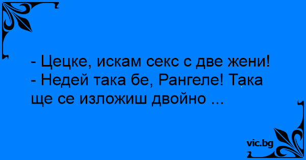 - Цецке, искам cekc с две жени!<br />- Недей така бе, Рангеле! Така ще се изложиш двойно ...
