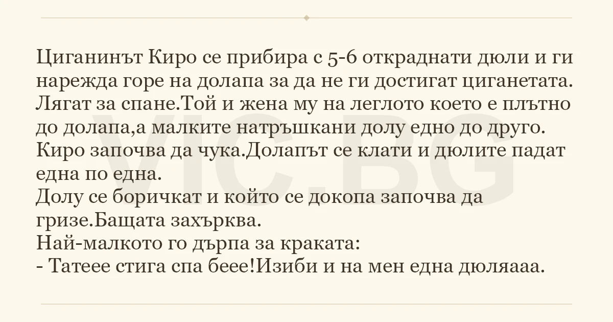 Циганинът Киро се прибира с 5-6 откраднати дюли и ги нарежда горе на дoлапа за да не ги достигат циганетата. Лягат за спане.Той и жена му на леглото което е плътно до дoлапа,а малките натръшкани долу едно до друго.