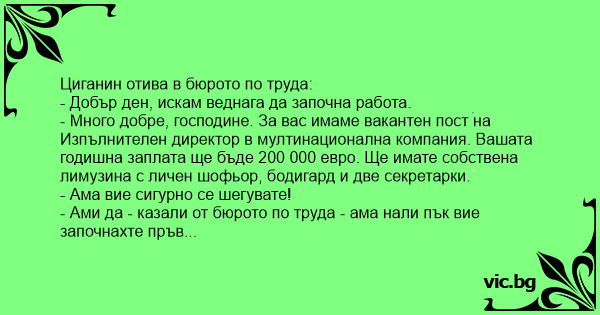 - Много добре, господине. За вас имаме вакантен пост на Изпълнителен директор в мултинационална компания. Вашата годишна заплата ще бъде 200 000 евро. Ще имате собствена лимузина с личен шофьор, бодигард и две секретарки.