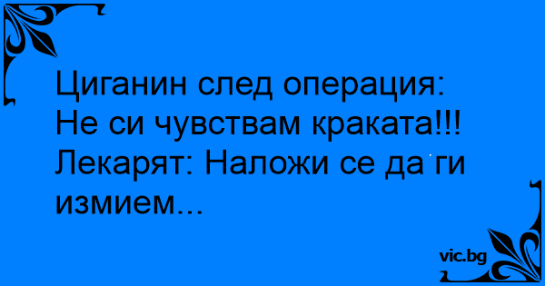 Буди се циго после операцију: - Како се осеќаш - прашуе га доктор? - Па добро е докторе, само ноге не ги осеќам! - Ааа, епа мораше да ги исперемо!