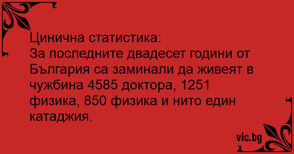 За последните двадесет години от България са заминали да живеят в чужбина 4585 доктора, 1251 физика, 850 физика и нито един катаджия.