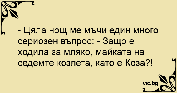 - Цяла нощ ме мъчи един много сериозен въпрос: - Защо е ходила за мляко, майката на седемте козлета, като е Коза?!