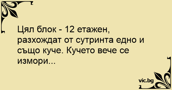 Цял блок - 12 етажен, разхождат от сутринта едно и също куче. Кучето вече се измори...