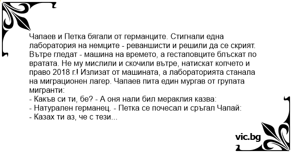 Вътре гледат - машина на времето, а гестаповците блъскат по вратата. Не му мислили и скочили вътре, натискат копчето и право 2018 г.! Излизат от машината, а лабораторията станала на миграционен лагер. Чапаев пита един мургав от групата мигранти: