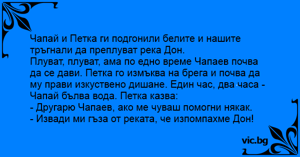Плуват, плуват, ама по едно време Чапаев почва да се дави. Петка го измъква на брега и почва да му прави изкуствено дишане. Един час, два часа - Чапай бълва вода. Петка казва: