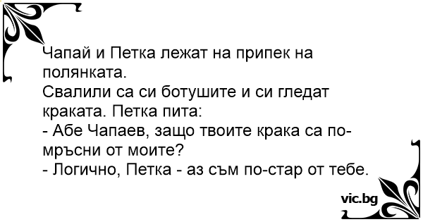 - Абе Чапаев, защо твоите крака са по-мръсни от моите?