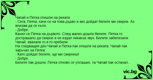 Качил се Петка на дървото. След малко дошли белите. Петка го дострашало да свирне и не издал никакъв звук. Белите забелязали Чапай, хванали го и го пребили.