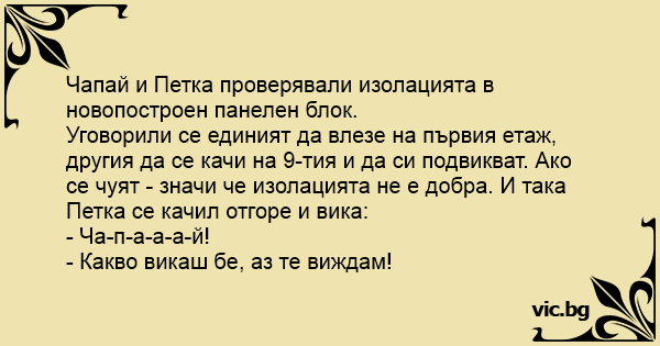 Уговорили се единият да влезе на първия етаж, другия да се качи на 9-тия и да си подвикват. Ако се чуят - значи че изолацията не е добра. И така Петка се качил отгоре и вика: