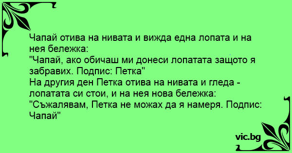 "Чапай, ако обичаш ми донеси лопатата защото я забравих. Подпис: Петка"